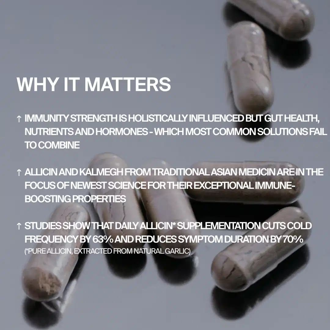 Enthaltenes Allicin aus Knoblauchextrakt entfaltet seine antimikrobiellen und antiviralen Eigenschaften, während Kalmegh (Andrographis) mit starken entzündungshemmenden Effekten die Immunabwehr unterstützt. Vitamin C, Zinkund Selen tragen zusätzlich zum Schutz der Zellen vor oxidativem Stress bei und fördern die normale Funktion des Immunsystems – für mehr Energie, Widerstandskraft und Vitalität im Alltag.